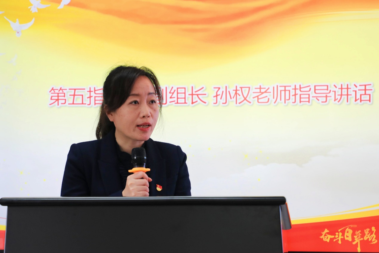 第五指导组副组长孙权作指导讲话。她表示,公司党委要深入贯彻公司党委关于开展党史学习教育的工作要求,把开展党史学习教育作为一项重大的政治任务。一是要坚持正确的理论指导和政治方向,紧密围绕学懂弄通做实党的创新理论,坚持学习党史和学习新中国史、改革开放史、社会主义发展史,同学习校史相结合。二是要高度重视,精心组织,将理论学习和实践活动相结合,全方位、多层次地组织学习教育活动;三是要立足公司,确保把全院师生党员的学习积极性调动起来,把党史学习教育和太阳集团tyc151团队建设发展结合起来,把太阳集团tyc151浓厚的学习氛围展现出来,确保学习走深走实取得实效。
