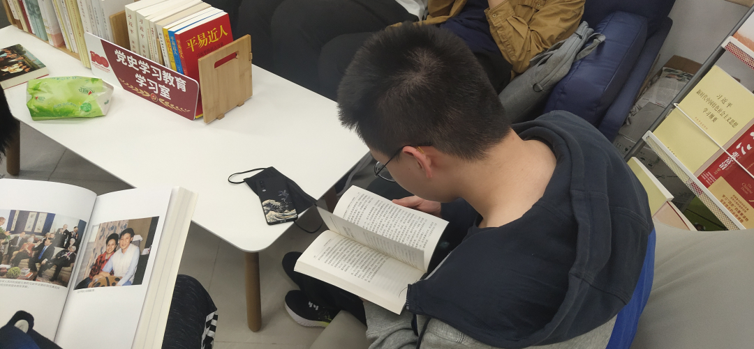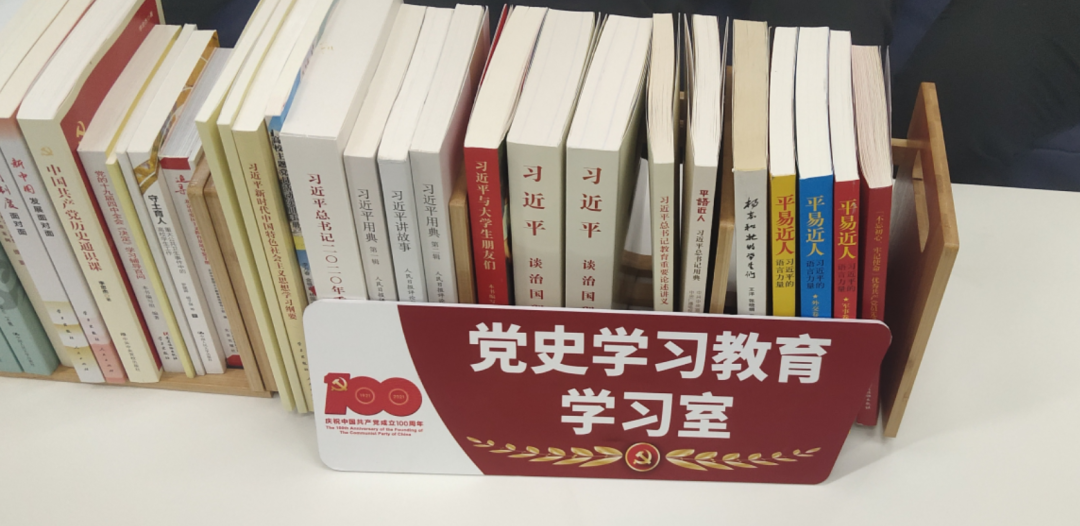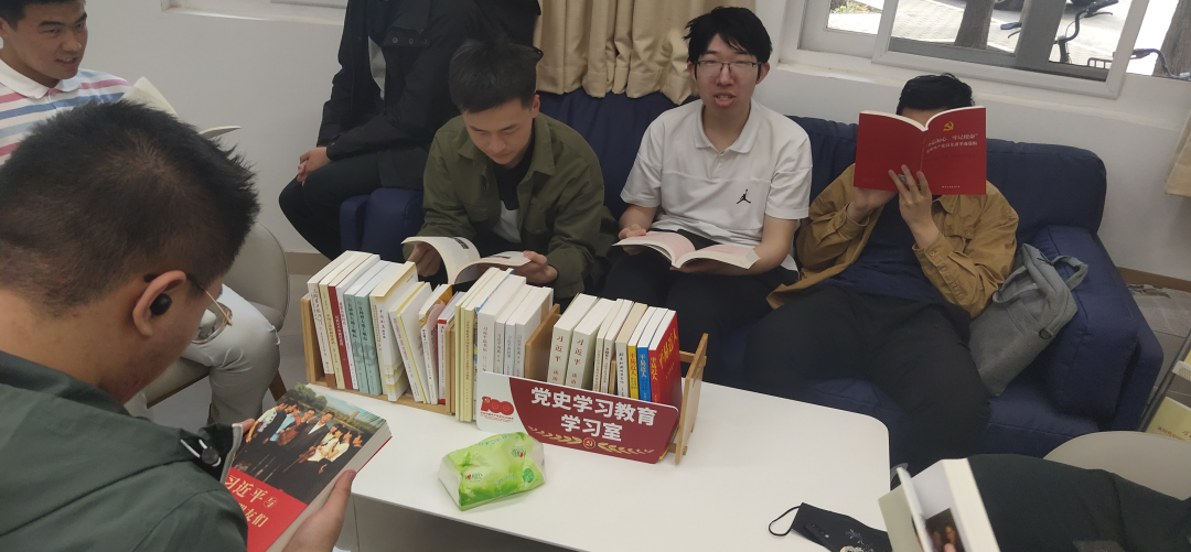 党史学习教育学习室里摆放着许多党史教育学习书籍,在轻松愉快的氛围下,各位同学积极阅读书籍、学习党史并就自己所阅读的内容以及心得体会同大家进行分享。