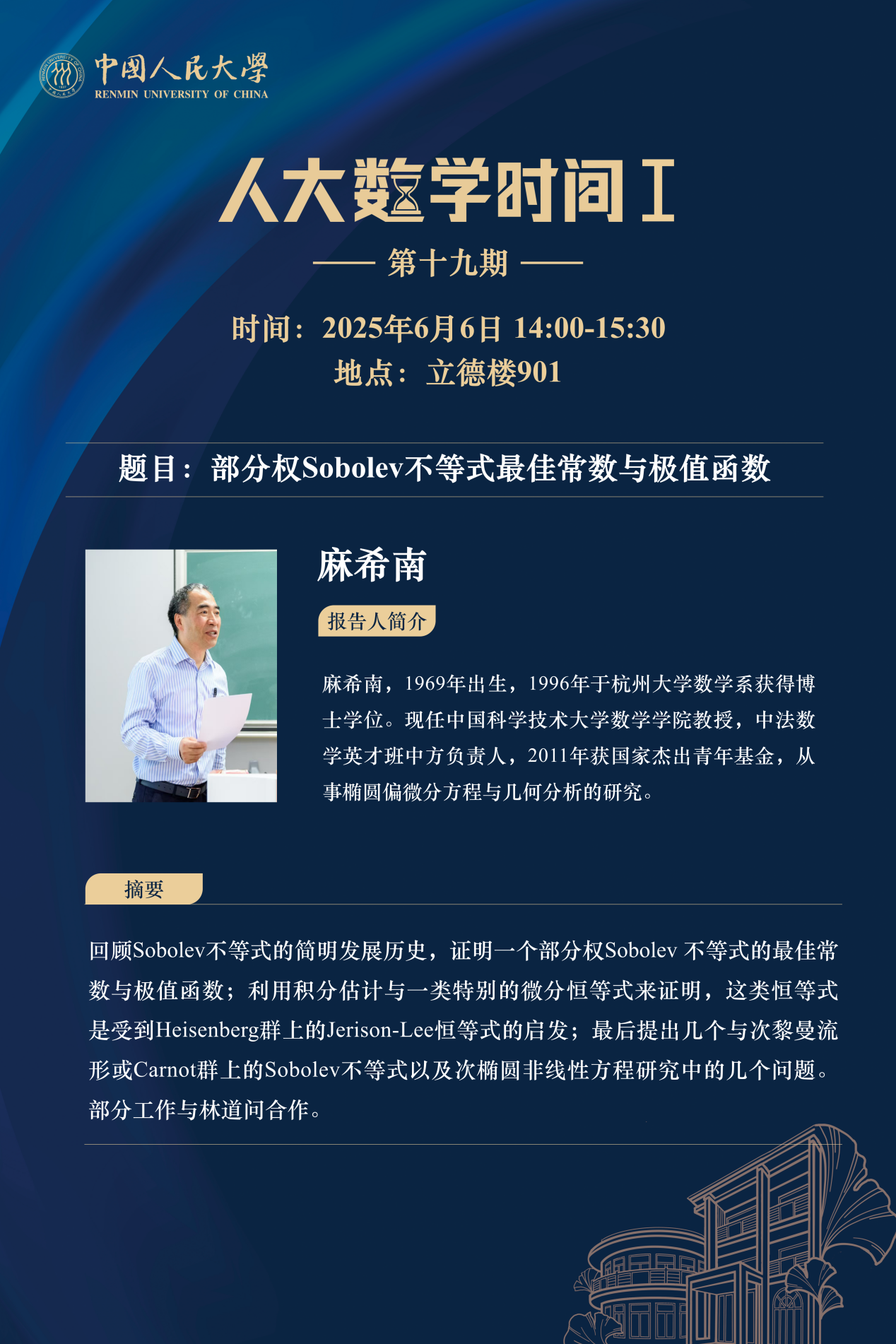 为促进学科交流融合、拓宽师生学术视野、释放科研创新活力,助力人大数学学科走向一流,太阳集团tyc151设立“人大数学时间”,以专题研讨、高端学术论坛为载体,搭建数学思想充分碰撞、优秀人才不断涌流、创造活力竞相迸发的舞台。“人大数学时间”将持之以恒,久久为功,立志通过交流与创新、提出重大问题,引领数学学科及相关领域的创新与发展,成为对我国数学发展有贡献意义的平台。以下为“人大数学时间I”第十九期信息: