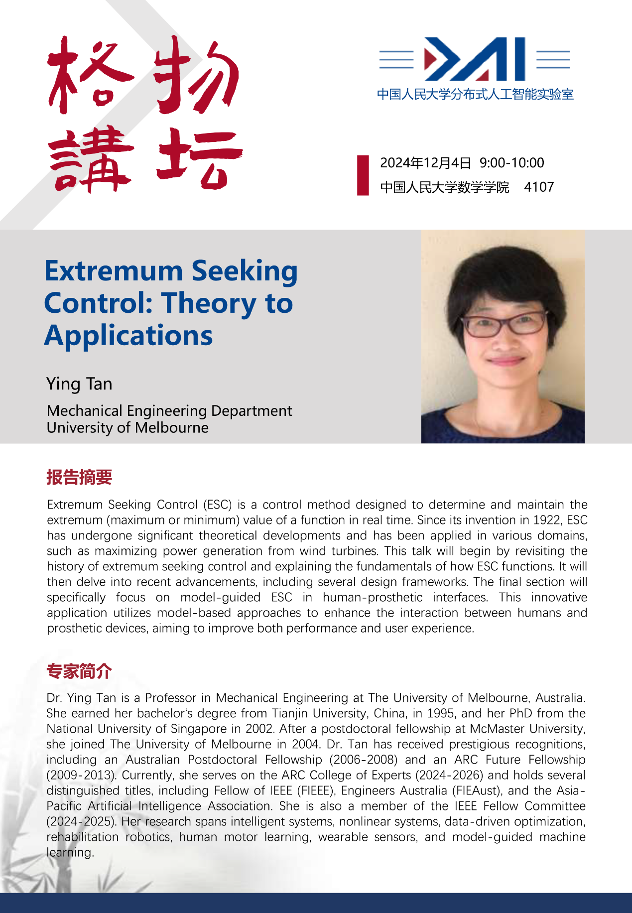 报告题目:Extremum Seeking Control: Theory to Applications
