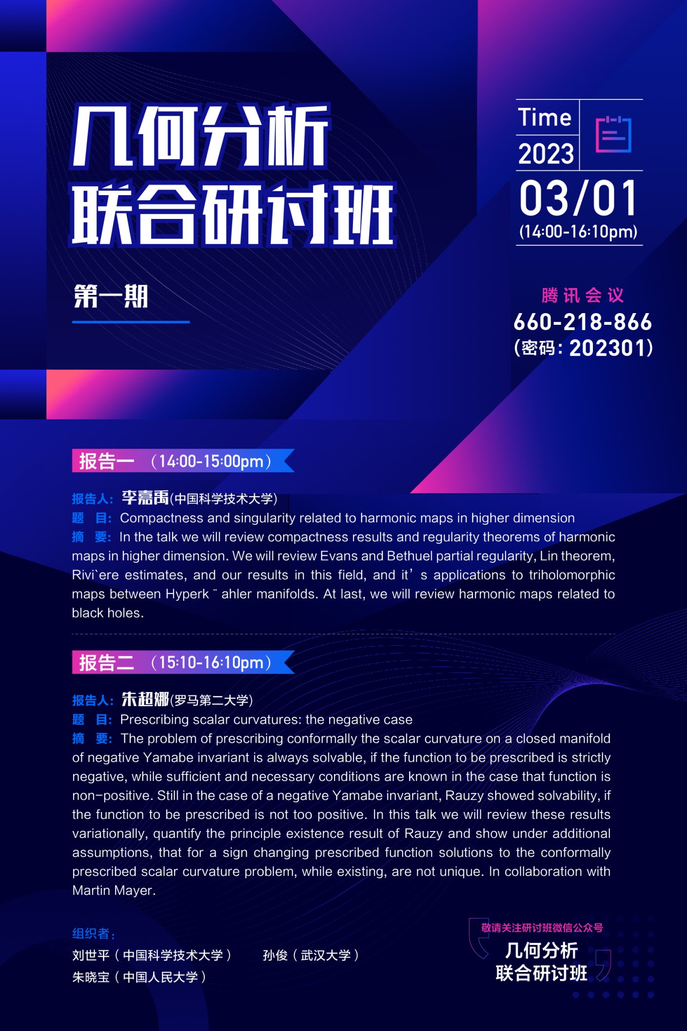 本次几何分析联合研讨班由公司朱晓宝老师、中国科学技术大学刘世平老师和武汉大学孙俊老师联合组织,欢迎感兴趣的老师和同学前来聆听学习!