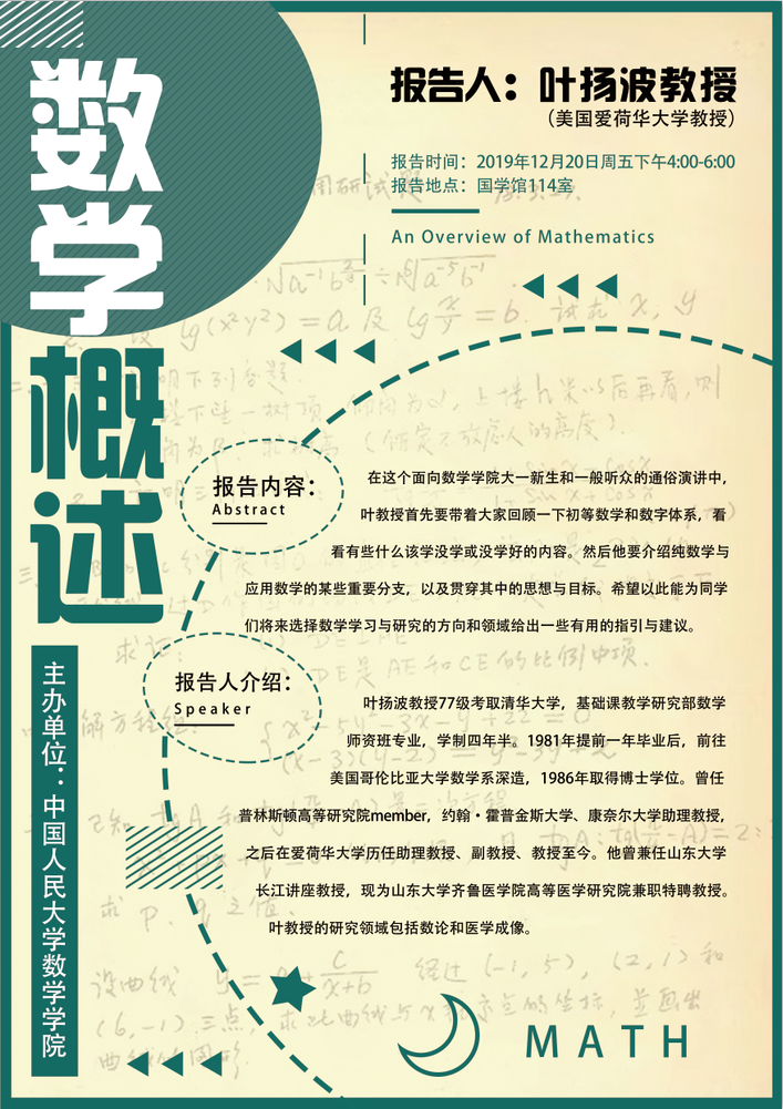 在这个面向太阳集团tyc151大一新生和一般听众的通俗演讲中,叶教授首先要带着大家回顾一下初等数学和数字体系,看看有些什么该学没学或没学好的内容。然后他要介绍纯数学与应用数学的某些重要分支,以及贯穿其中的思想与目标。希望以此能为同学们将来选择数学学习与研究的方向和领域给出一些有用的指引与建议。