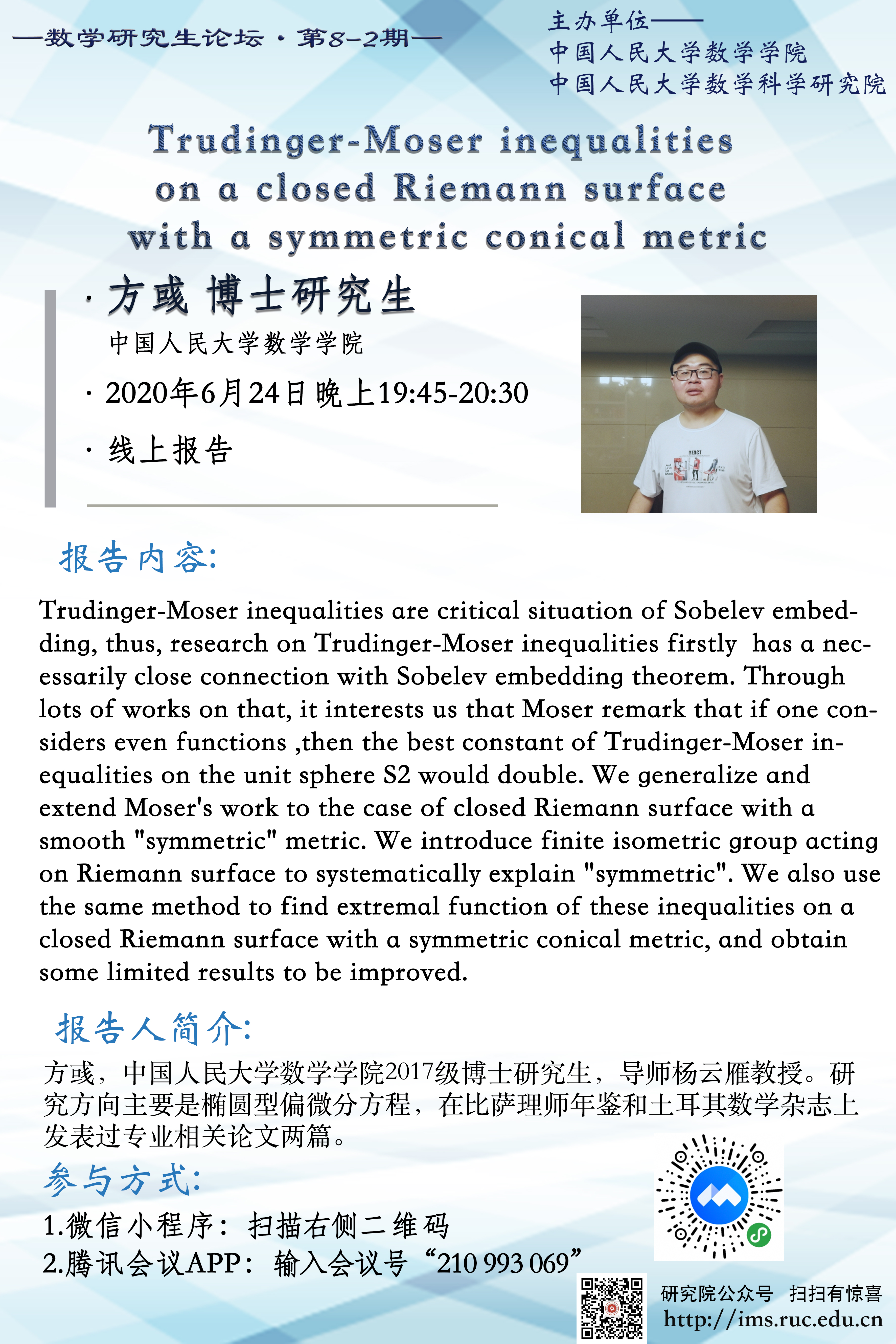 太阳集团tyc151研究生论坛 8-2期—Trudinger-Moser inequalities on a closed Riemann surface with a symmetric conical metric
