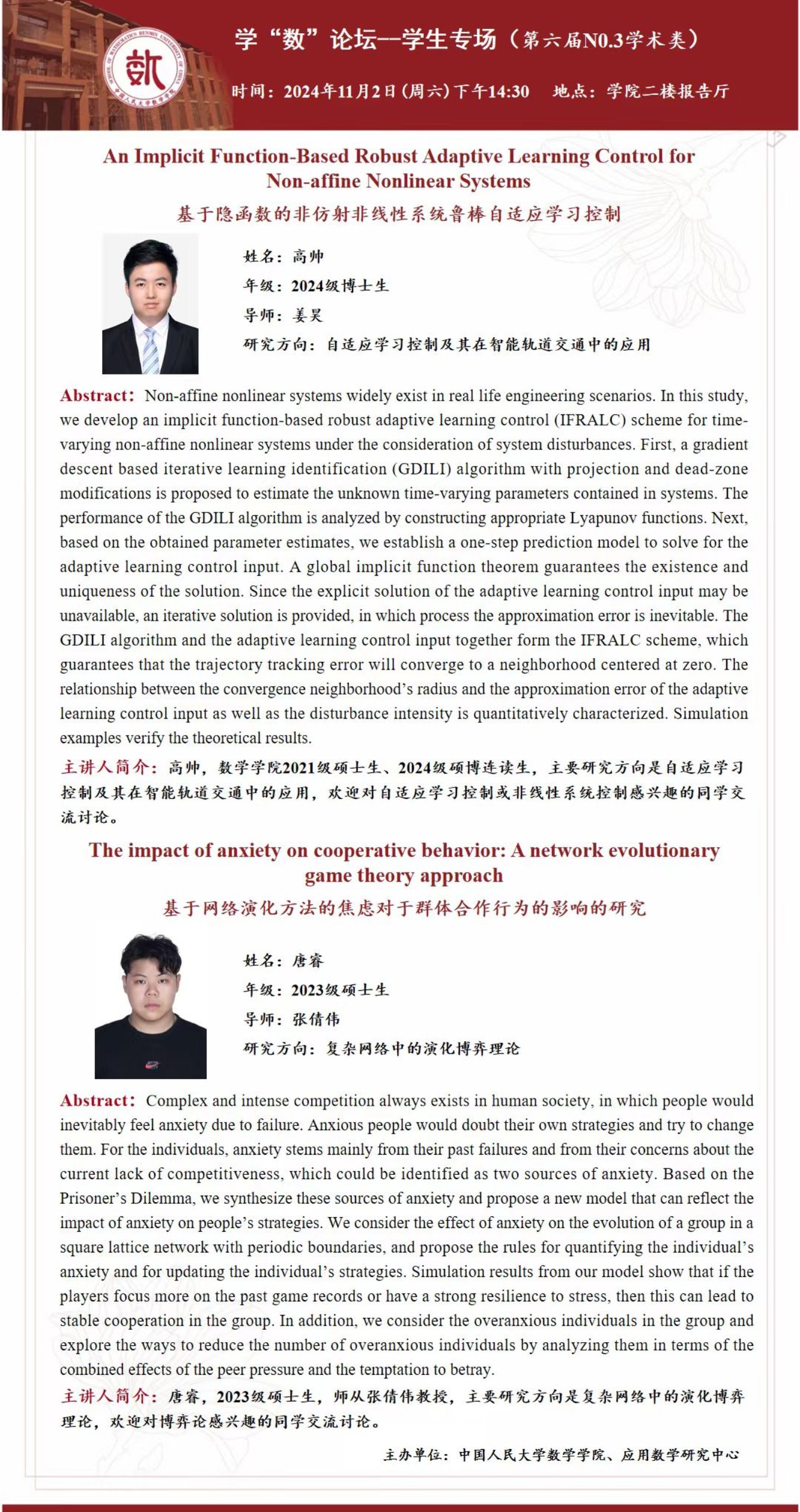 本场报告类型为学术类,将于2024年11月2日(星期六)下午14:30,在太阳集团tyc151二楼报告厅进行,报告主讲人为2024级硕博连读生高帅同学和2023级硕士生唐睿同学。