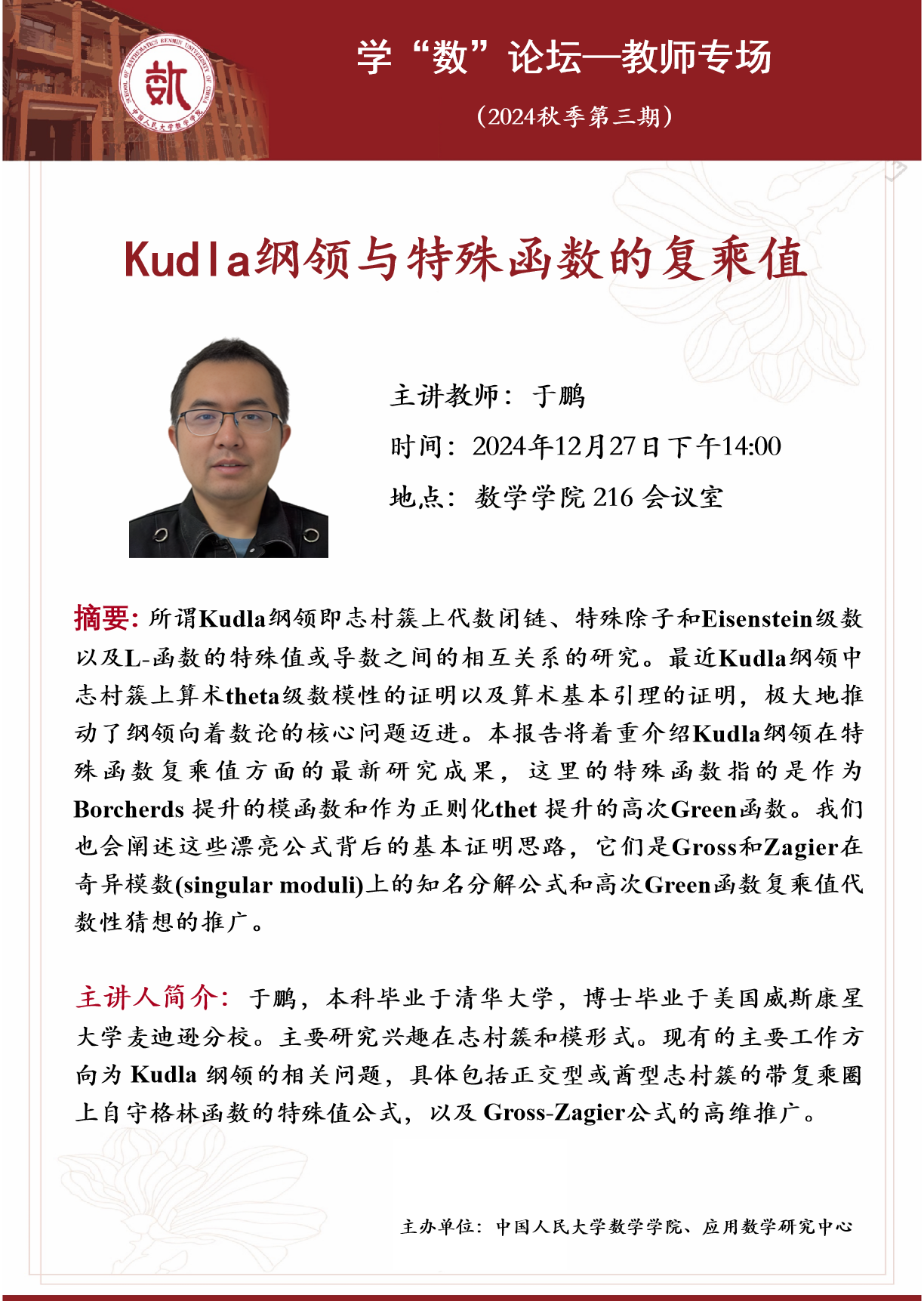 主讲人简介:于鹏,本科毕业于清华大学,博士毕业于美国威斯康星大学麦迪逊分校。主要研究兴趣在志村簇和模形式。现有的主要工作方向为 Kudla 纲领的相关问题,具体包括正交型或酋型志村簇的带复乘圈上自守格林函数的特殊值公式,以及 Gross-Zagier公式的高维推广。