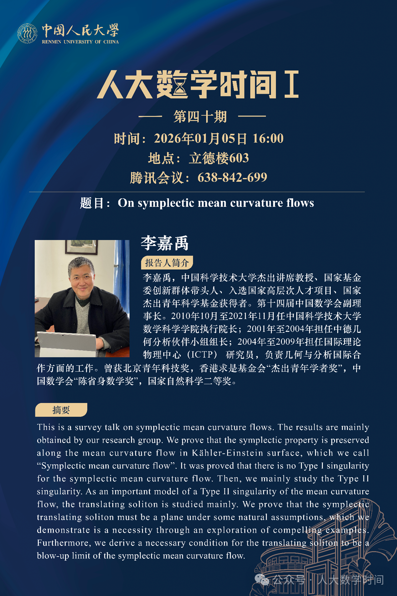 为促进学科交流融合、拓宽师生学术视野、释放科研创新活力,助力人大数学学科走向一流,太阳集团tyc151设立“人大数学时间”,以专题研讨、高端学术论坛为载体,搭建数学思想充分碰撞、优秀人才不断涌流、创造活力竞相迸发的舞台。“人大数学时间”将持之以恒,久久为功,立志通过交流与创新、提出重大问题,引领数学学科及相关领域的创新与发展,成为对我国数学发展有贡献意义的平台。以下为“人大数学时间I”第四十期信息: