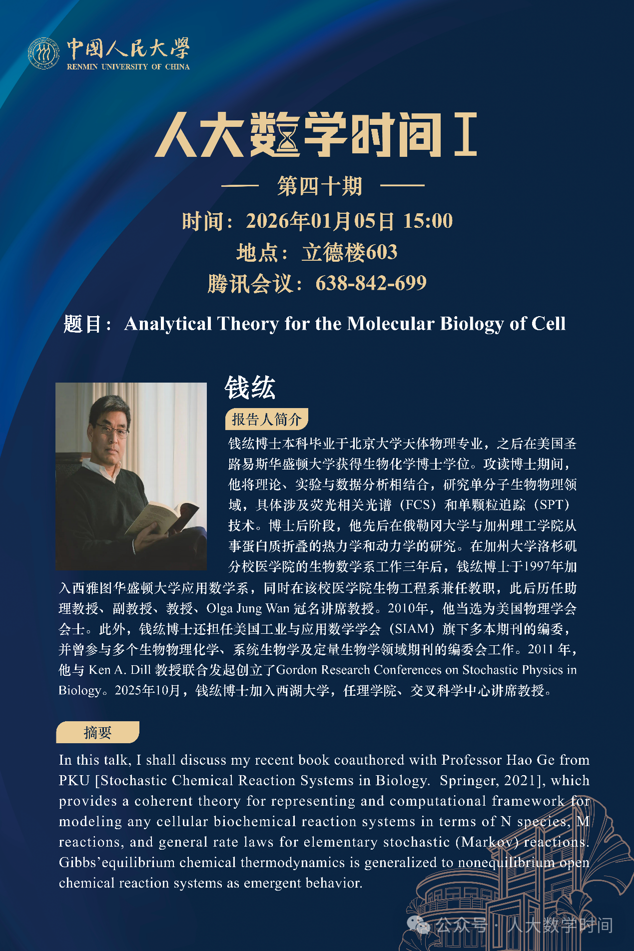 报告题目:Analytical Theory for the Molecular Biology of Cell