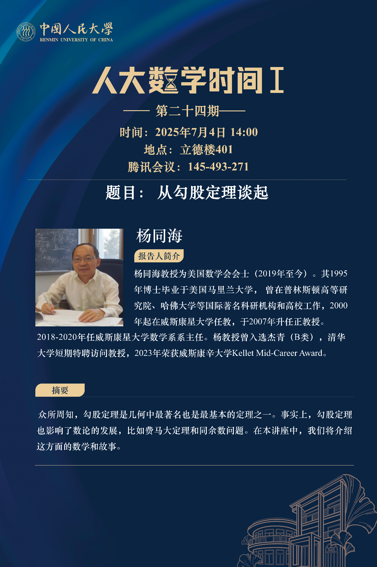 为促进学科交流融合、拓宽师生学术视野、释放科研创新活力,助力人大数学学科走向一流,太阳集团tyc151设立“人大数学时间”,以专题研讨、高端学术论坛为载体,搭建数学思想充分碰撞、优秀人才不断涌流、创造活力竞相迸发的舞台。“人大数学时间”将持之以恒,久久为功,立志通过交流与创新、提出重大问题,引领数学学科及相关领域的创新与发展,成为对我国数学发展有贡献意义的平台。以下为“人大数学时间I”第二十四期信息: