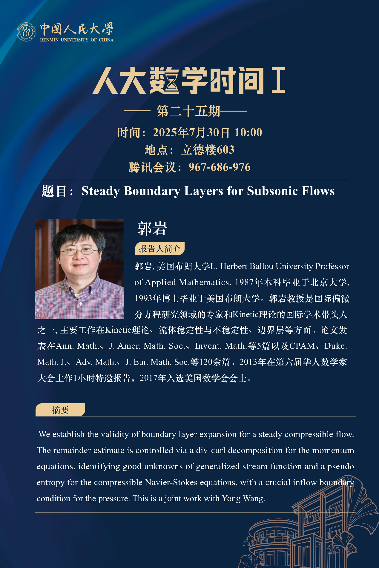 郭岩, 美国布朗大学L. Herbert Ballou University Professor of Applied Mathematics, 1987年本科毕业于北京大学, 1993年博士毕业于美国布朗大学。郭岩教授是国际偏微分方程研究领域的专家和Kinetic理论的国际学术带头人之一, 主要工作在Kinetic理论、流体稳定性与不稳定性、边界层等方面。论文发表在Ann. Math.、J. Amer. Math. Soc.、Invent. Math.等5篇以及CPAM、Duke. Math. J.、Adv. Math.、J. Eur. Math. Soc.等120余篇。2013年在第六届华人数学家大会上作1小时特邀报告,2017年入选美国数学会会士。