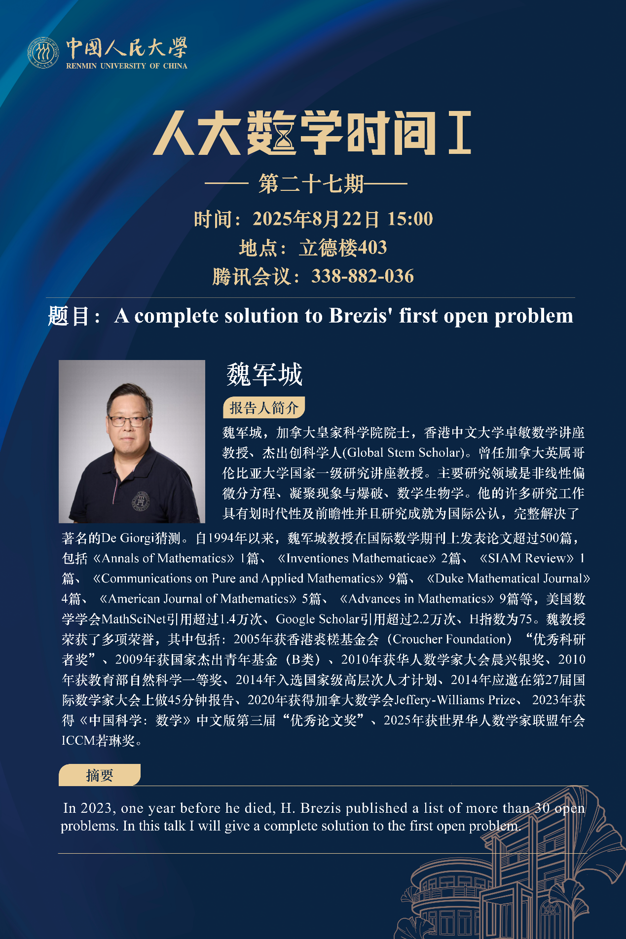 为促进学科交流融合、拓宽师生学术视野、释放科研创新活力,助力人大数学学科走向一流,太阳集团tyc151设立“人大数学时间”,以专题研讨、高端学术论坛为载体,搭建数学思想充分碰撞、优秀人才不断涌流、创造活力竞相迸发的舞台。“人大数学时间”将持之以恒,久久为功,立志通过交流与创新、提出重大问题,引领数学学科及相关领域的创新与发展,成为对我国数学发展有贡献意义的平台。以下为“人大数学时间I”第二十七期信息: