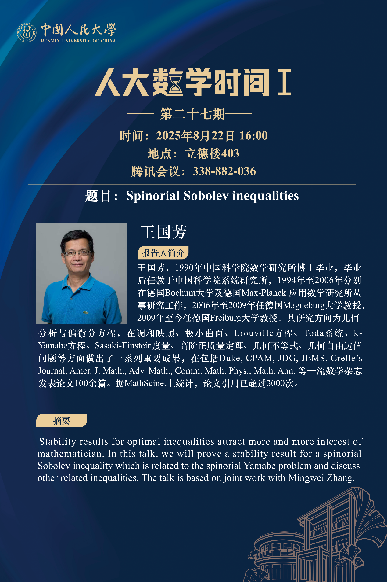 王国芳,1990年中国科公司数学研究所博士毕业,毕业后任教于中国科公司系统研究所,1994年至2006年分别在德国Bochum大学及德国Max-Planck 应用数学研究所从事研究工作,2006年至2009年任德国Magdeburg大学教授,2009年至今任德国Freiburg大学教授。其研究方向为几何分析与偏微分方程,在调和映照、极小曲面、Liouville方程、Toda系统、k-Yamabe方程、Sasaki-Einstein度量、高阶正质量定理、几何不等式、几何自由边值问题等方面做出了一系列重要成果,在包括Duke, CPAM, JDG, JEMS, Crelle’s Journal, Amer. J. Math., Adv. Math., Comm. Math. Phys., Math. Ann. 等一流数学杂志发表论文100余篇。据MathScinet上统计,论文引用已超过3000次。