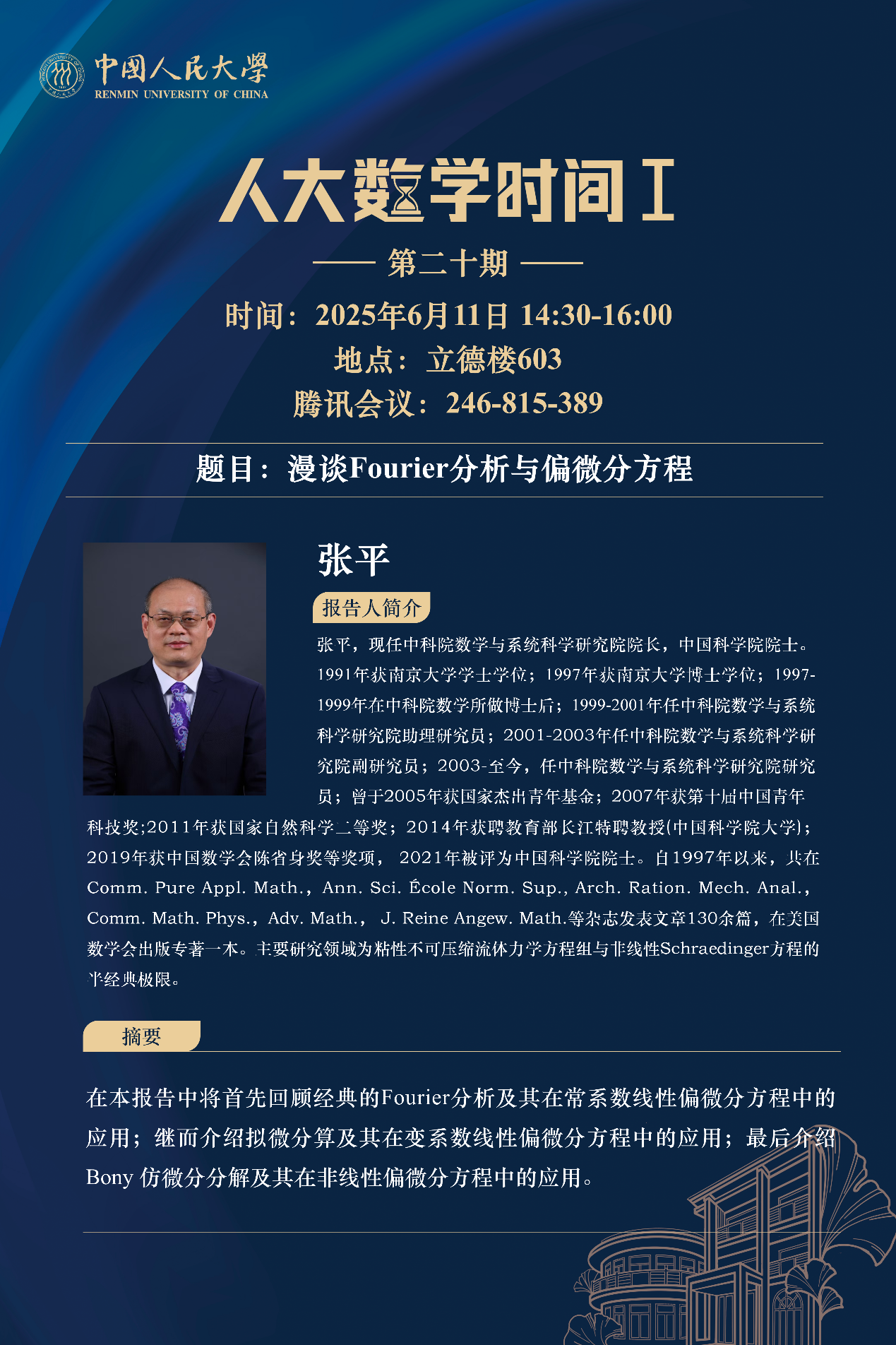 时间:6月11日(周三)14:30—16:00 张平院士报告及其前沿问题探讨