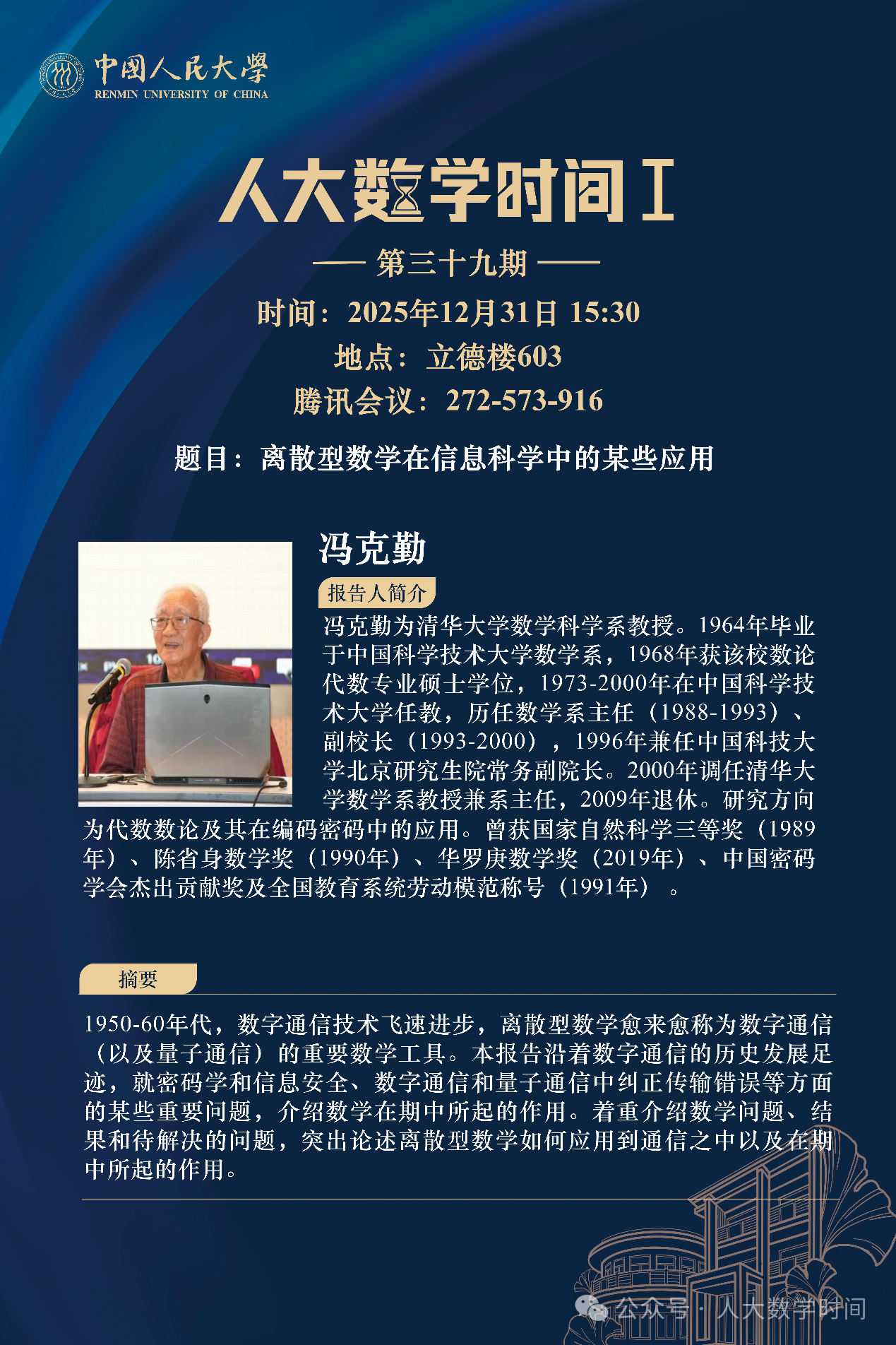 为促进学科交流融合、拓宽师生学术视野、释放科研创新活力,助力人大数学学科走向一流,太阳集团tyc151设立“人大数学时间”,以专题研讨、高端学术论坛为载体,搭建数学思想充分碰撞、优秀人才不断涌流、创造活力竞相迸发的舞台。“人大数学时间”将持之以恒,久久为功,立志通过交流与创新、提出重大问题,引领数学学科及相关领域的创新与发展,成为对我国数学发展有贡献意义的平台。以下为“人大数学时间I”第三十九期信息: