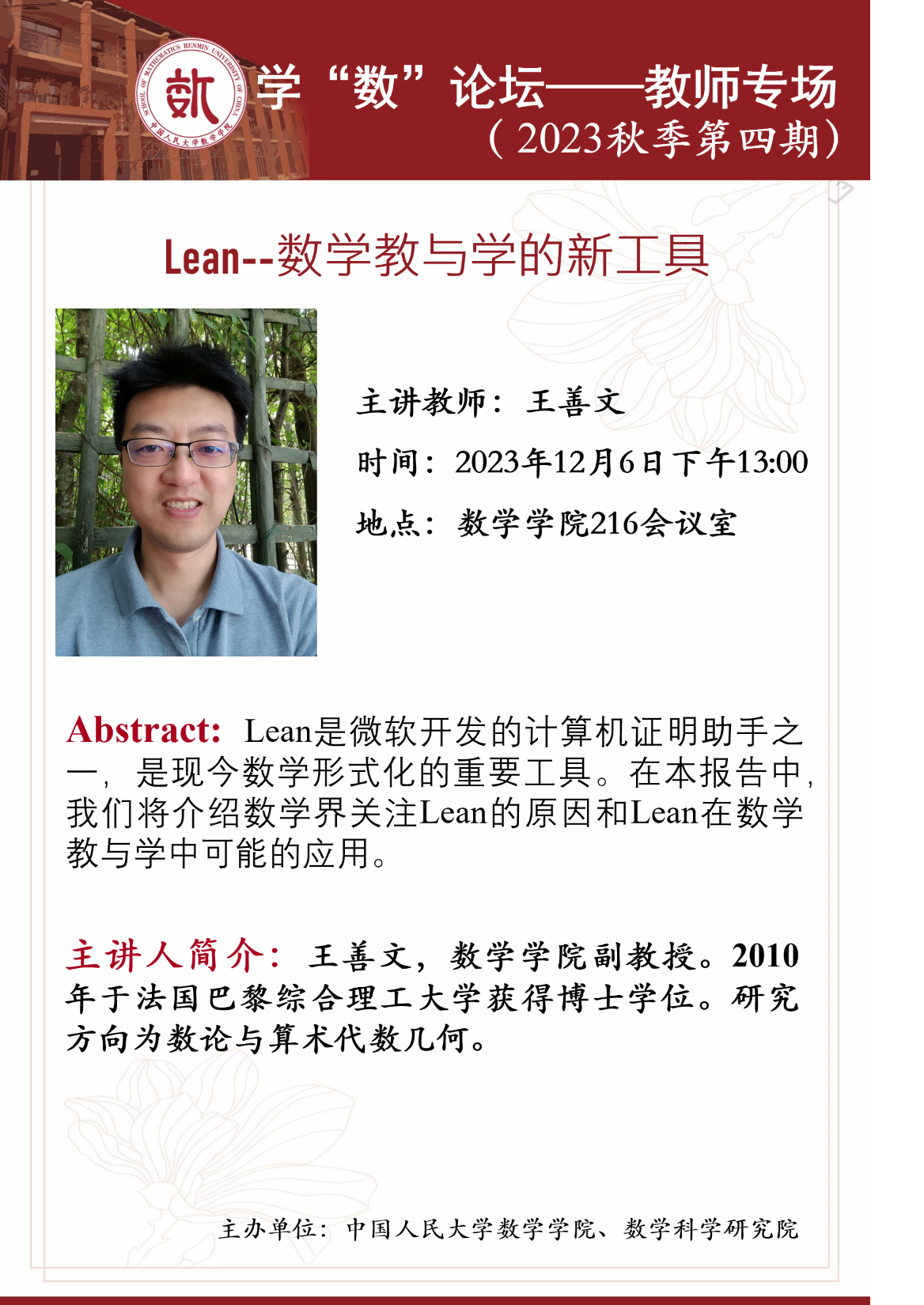 教师专场的第三期报告将于2023年12月6日下午13:00在太阳集团tyc151216会议室举行,本场报告的主讲教师为王善文,报告题目为《Lean--数学教与学的新工具》。