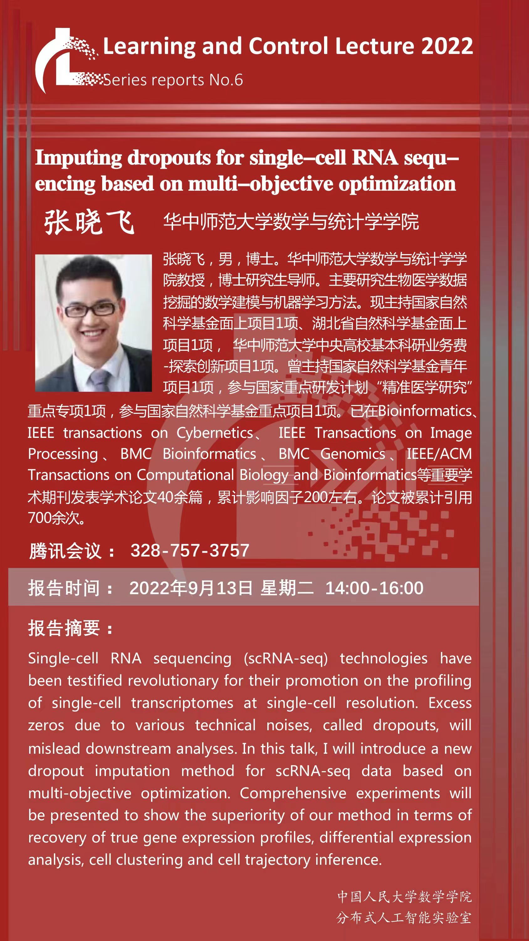 Learning and Control Lecture 2022系列学术报告—— Imputing dropouts for single-cell RNA sequencing based on multi-objective optimization