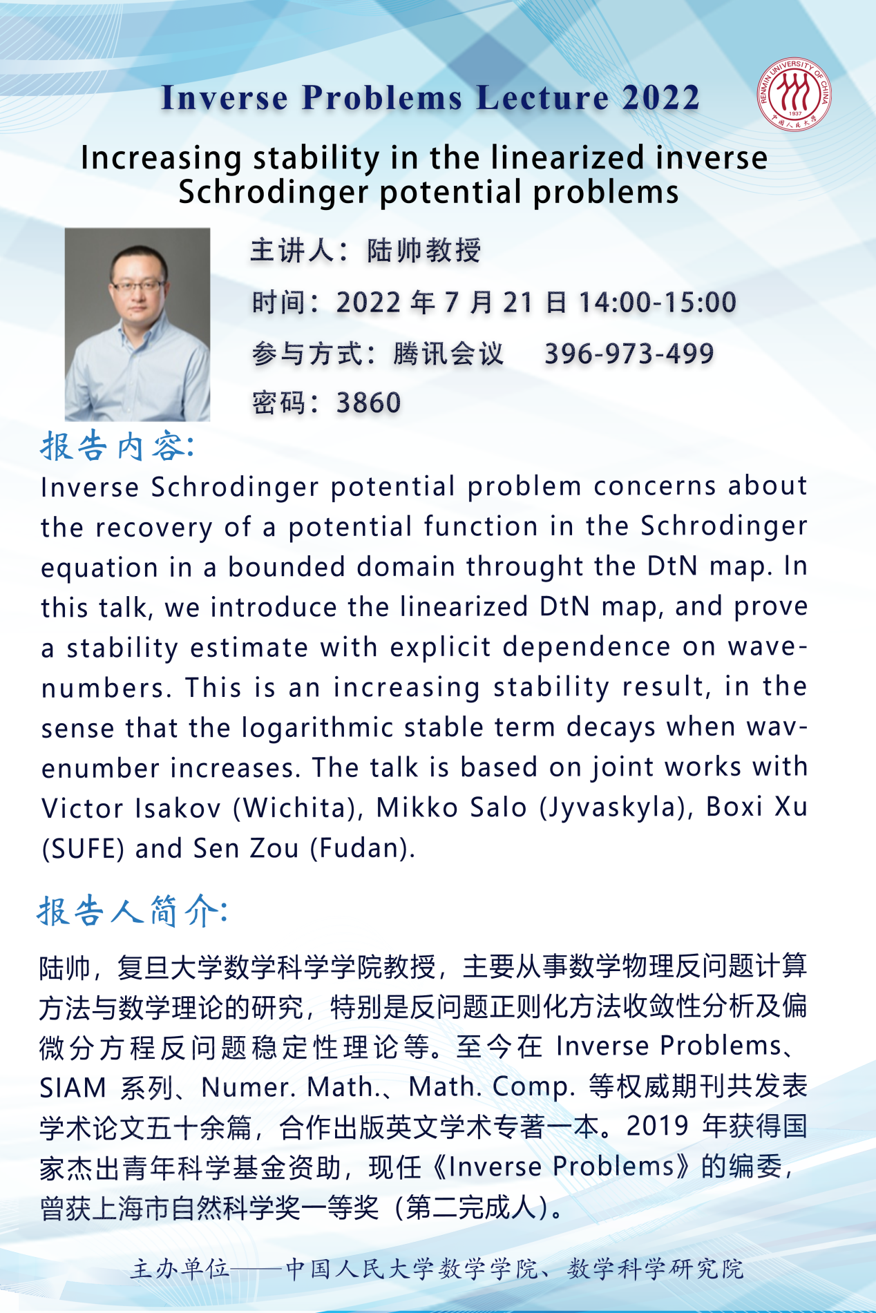 报告人简介:陆帅,复旦大学数学科学公司教授,主要从事数学物理反问题计算方法与数学理论的研究,特别是反问题正则化方法收敛性分析及偏微分方程反问题稳定性理论等。至今在Inverse ProblemsSIAM系列、Numer. Math.Math. Comp.等权威期刊共发表学术论文五十余篇,合作出版英文学术专著一本。2019年获得国家杰出青年科学基金资助,现任《Inverse Problems》的编委,曾获上海市自然科学奖一等奖(第二完成人)。