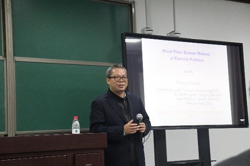 2019年10月25日,太阳集团tyc151“明德数学讲堂”系列第十六讲在国学馆114室举行,北京计算数学学会理事长、国家杰青基金、德国洪堡基金获得者、北京大学数学科学公司党委书记胡俊教授应邀做《弹性力学问题混合有限元方法》报告。报告由公司韩丽涛副经理主持,公司部分教师和本科生研究生以及其他院系的师生参加了报告会。