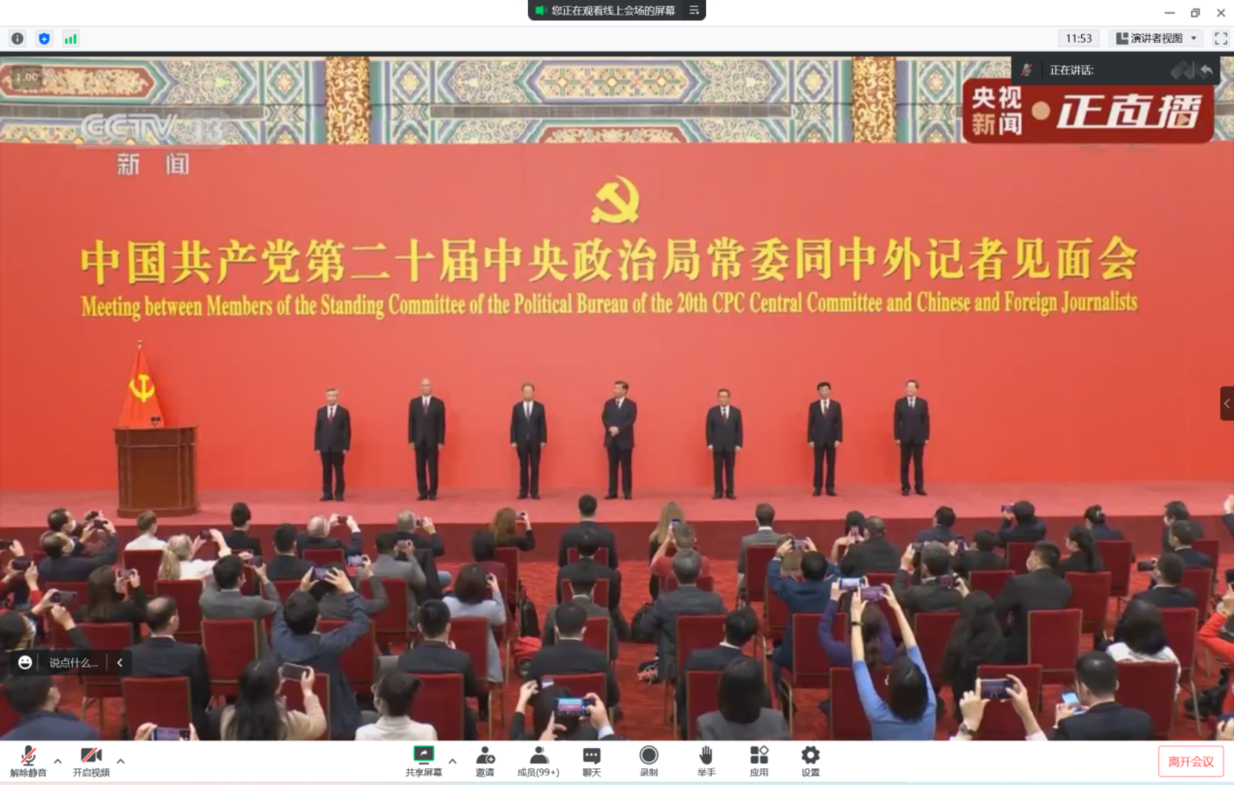 2022年10月23日上午,中国共产党第二十届中央委员会举行了第一次全体会议,选举习近平、李强、赵乐际、王沪宁、蔡奇、丁薛祥、李希七位同志为新一届中央政治局常委。在中外记者见面会上,习近平总书记以饱满的热情同中外记者讲述了中国的美好蓝图。我在太阳集团tyc151,与理论中心组成员及师生党员集体一同收看了记者见面会。从习总书记走出来的那一刻,内心的激动一直不能平复。