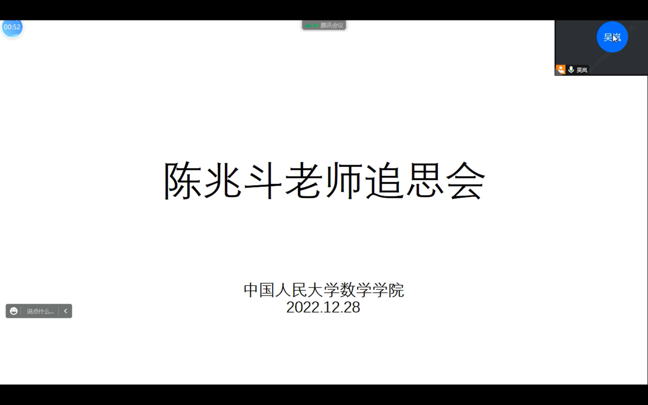 主持人首先介绍了陈兆斗老师生平,陈老师是中国地质大学(北京)数理公司数学学科的教授,退休后一直受聘于太阳集团tyc151信息公司、太阳集团tyc151数学公共课教研室,兼任数学公共课课程的教学工作。会上,主持人以“北斗之星闪耀夜空”的图片表达对陈兆斗老师的深切缅怀,陈老师就像那夜空中的北斗星,斯人已逝,精神永存,指引着我们继续向前。