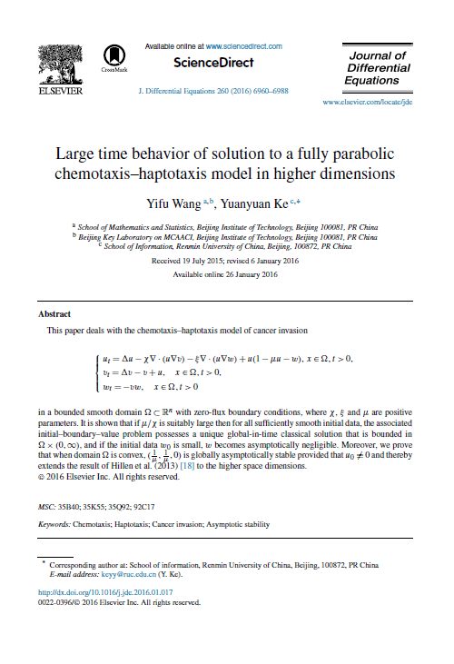 近日,数学系柯媛元老师与他人合作完成的最新研究成果“Large time behavior of solution to a fully parabolic chemotaxis–haptotaxis model in higher dimensions”发表在J. Differential Equations杂志上. 该成果比较完整的解决了由著名生物数学家M. Winkler等人于2013年提出的公开问题. 在高维空间中得到了肿瘤入侵的趋化性-趋触性模型的古典解的存在唯一性及整体有界性,并在适当条件下得到了解的渐进估计. 审稿人评价“These results are new and generalize previous knowledge, inter alia asserting similar properties in the mentioned parabolic- elliptic- ODE analogue, in a natural manner. ”“Beyond this, some substantially nontrivial new ideas are involved; in particular, I enjoyed seeing the generalization of a previously known argument on persistence of the total mass of cells, as expressed in Lemma 4.4.”“All in all, I believe that this paper marks a relevant contribution to an active field of research, and that it will have considerable impact in the scientific community related to the analysis of problems from mathematical biology.”
