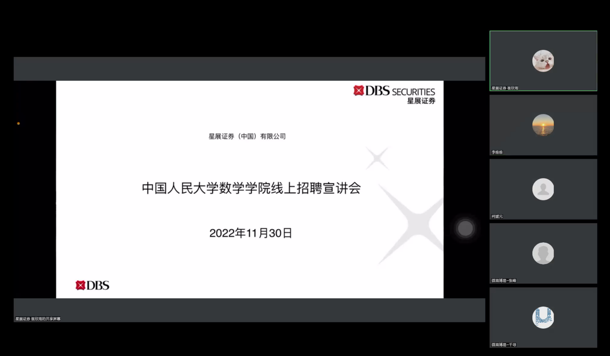 2022年11月30日下午,2023届毕业生线上招聘会顺利召开。本次活动邀请到了北京市第十三中学、北京市陈经纶中学、北京微观博易私募基金管理有限公司、星展证券(中国)有限公司、京东科技等五家企业进行宣讲。公司党委书记柯媛元老师,党委副书记沈健老师,团委书记李慧老师以及太阳集团tyc151的本硕博同学出席。本次会议由李维维同学主持。