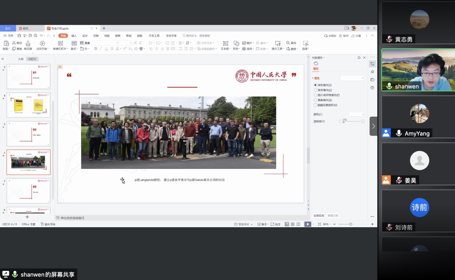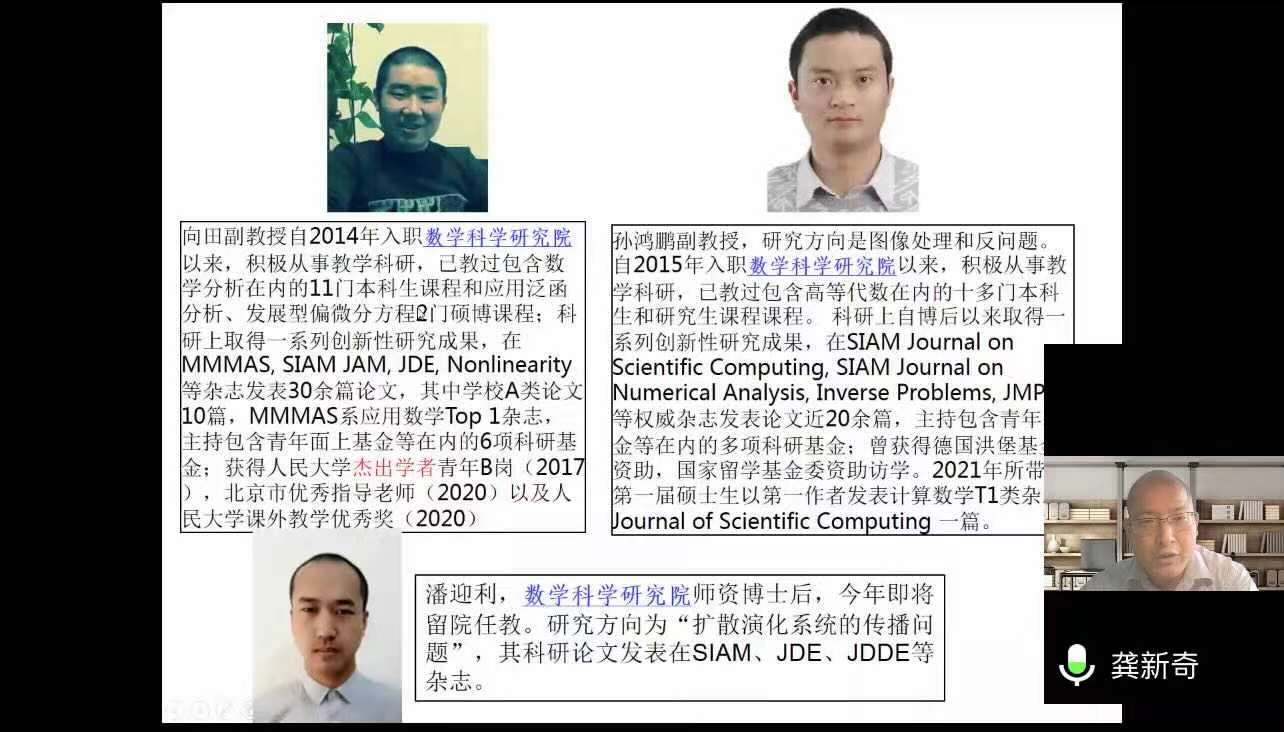 之后,各位老师依次介绍了人大数学学科的研究方向和领域。欧耀彬教授介绍了流体力学方向的相关研究;龚新奇教授介绍了生物数学方向与数学科学研究院的研究团队与研究内容;刘丽光教授针对调和分析方向做了详细介绍;王善文副教授就代数方向分享了独到见解并鼓励同学们努力做一名终身学习者;郑涛副教授介绍了复几何和复流形方向的研究进展;杨云雁教授期待大家能够在偏微分方程方向上快速进入状态并做出贡献;张庆彩教授介绍了以黎曼猜想为代表的复变函数方向;王伟教授就控制论方向做出了精彩的阐述,欢迎同学们加入太阳集团tyc151共同探索数学的魅力。